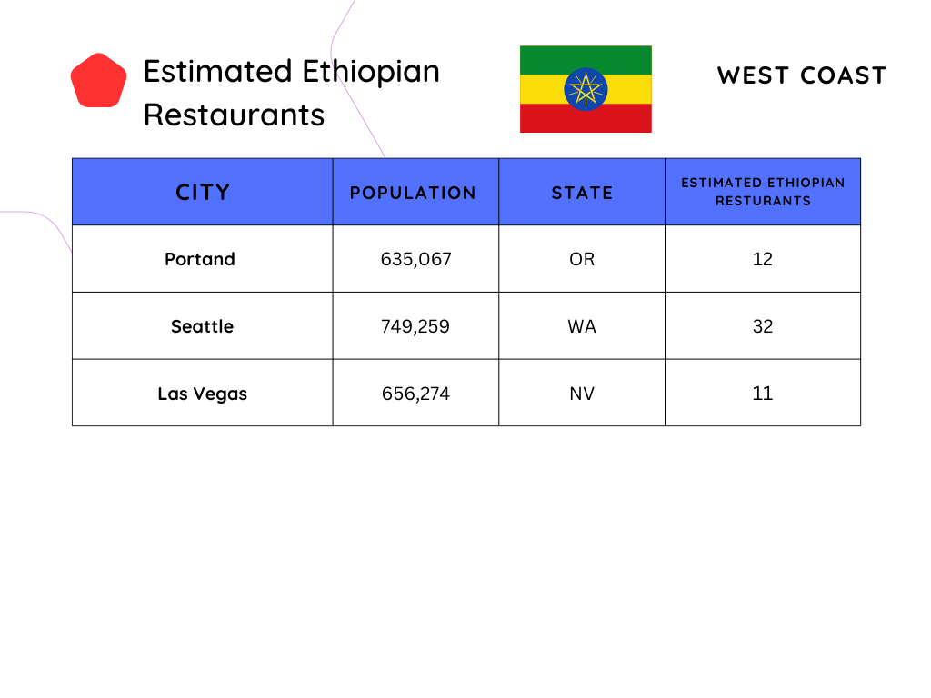 The West Coast is home to a large Ethiopian and Eritrean population. Cities such as Los Angeles, California, and Seattle, Washington, have become hubs for Ethiopian cuisine, attracting both Ethiopians and non-Ethiopians alike. The West Coast also includes cities like Denver, Colorado; Phoenix, Arizona; and Portland, Oregon. The chart below outlines the estimated number of Ethiopian restaurants on the West Coast.