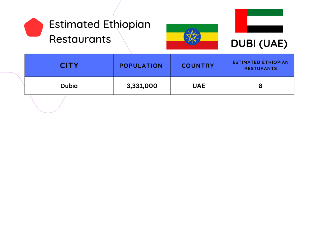 Dubai, in the United Arab Emirates, has emerged as a popular destination for business and tourism. Many Ethiopians live and work there, and according to our estimates, there are more than eight Ethiopian restaurants in the city.