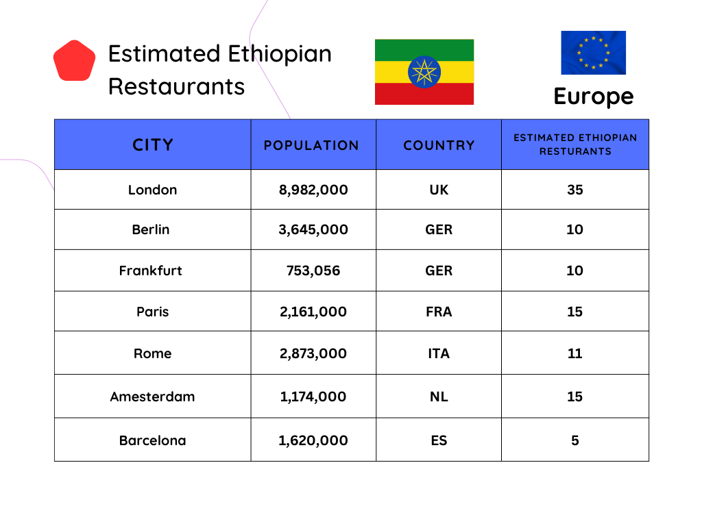Ethiopian restaurants in Europe are flourishing due to the large number of Ethiopians and Eritreans living on the continent. In cities like London, United Kingdom, and Berlin, Germany, Ethiopian food has become quite popular. The chart below presents an estimate of Ethiopian restaurants in Europe.