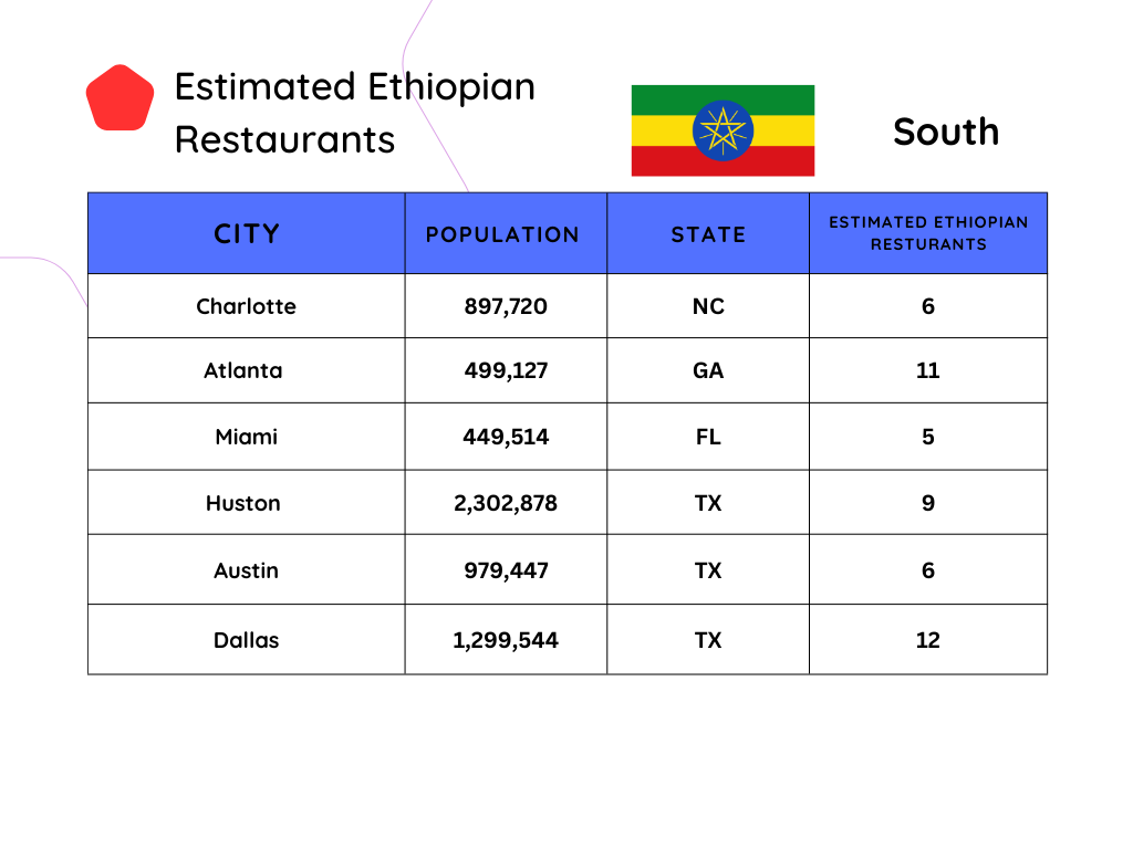 The South has seen a noticeable increase in the number of Ethiopian restaurants. In cities like Charlotte, North Carolina, and Atlanta, Georgia, residents have embraced Ethiopian food and culture. This region includes cities like Houston, Austin, and Dallas, Texas. However, Ethiopian restaurants are scarce in the Miami area, possibly due to the high cost of operating a business in this expensive real estate market. The chart below shows the estimated number of restaurants in the South.