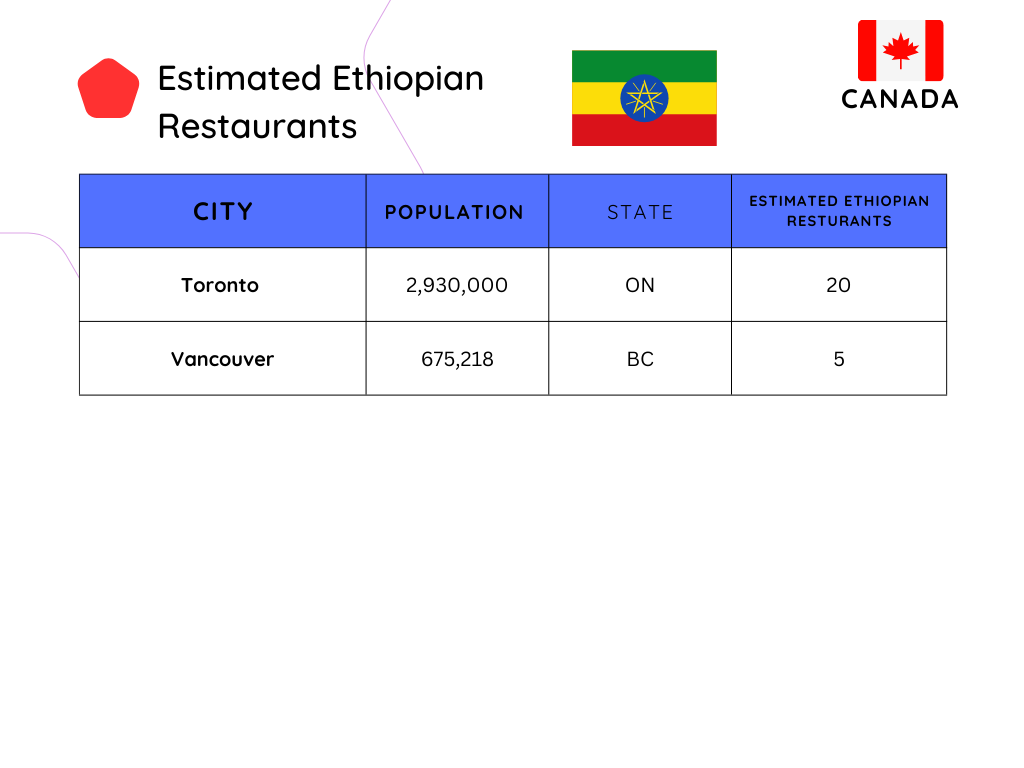 The number of Ethiopian restaurants in Canada is surprisingly high, primarily due to the significant Ethiopian and Eritrean communities in cities like Toronto and Vancouver. Both cities have more than 25 Ethiopian restaurants.