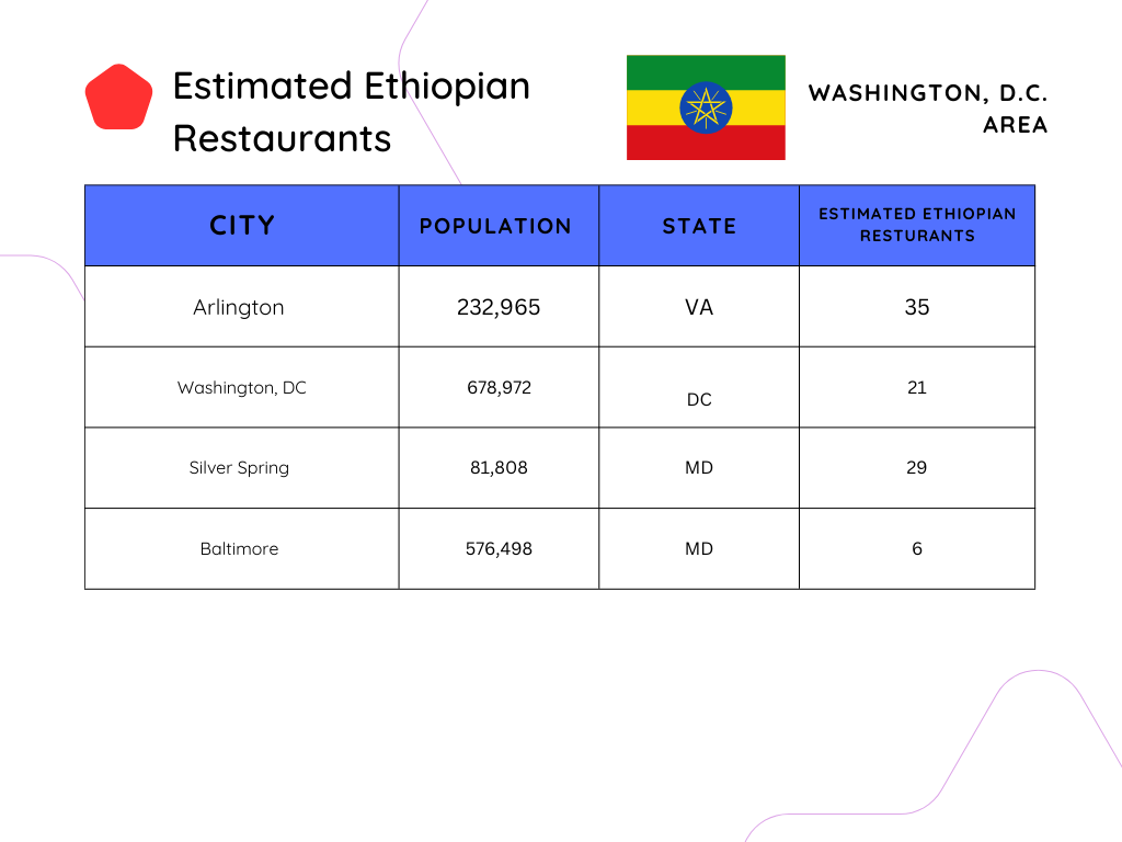 The Washington, D.C. area has the largest concentration of Ethiopian restaurants compared to other regions across the country. This area includes Arlington, VA, Silver Spring, MD, Baltimore, MD, and Washington, D.C. itself. The table below provides an estimated count of Ethiopian restaurants in this region.